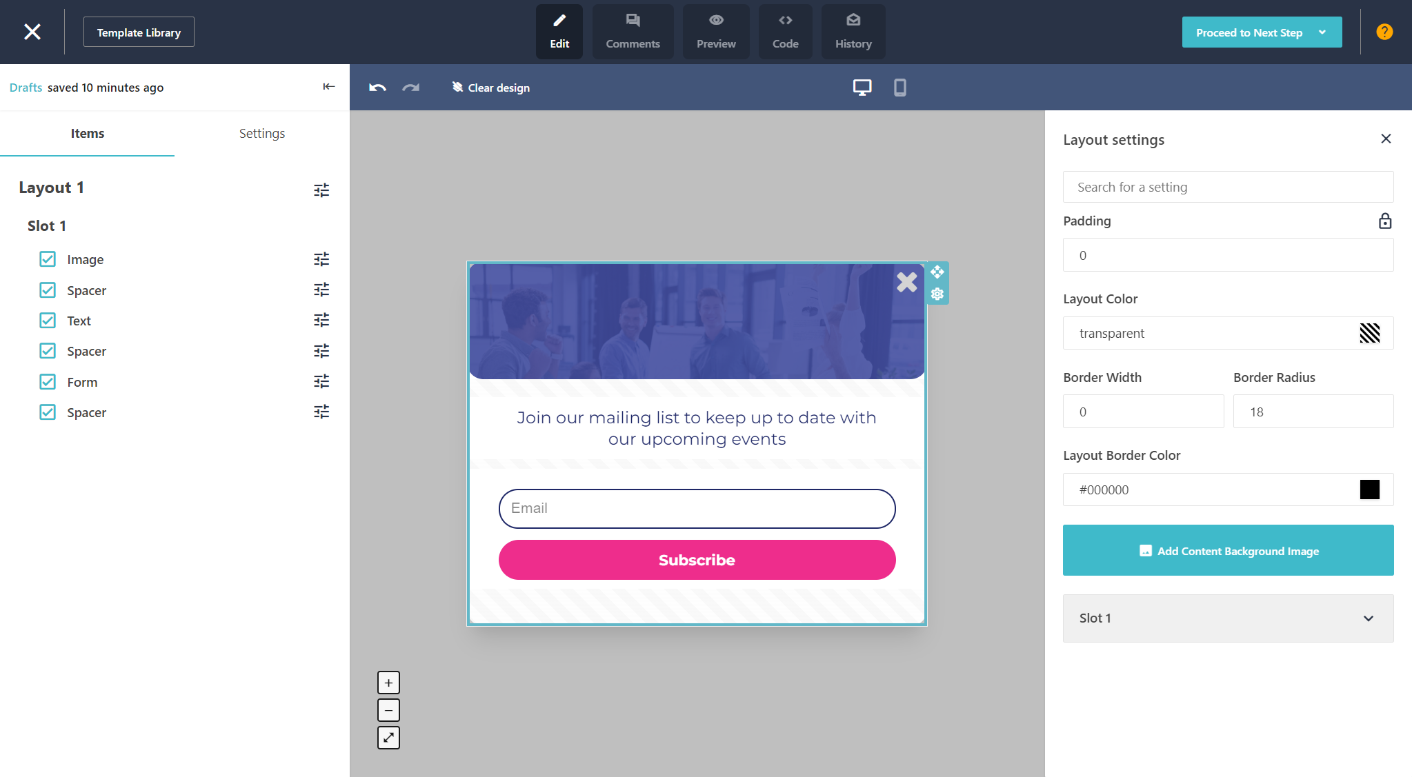 Proceed to Next Step | Allows you to update the template and exit the designer. You can also save a subscription form as a template or save a subscription form as a draft. |